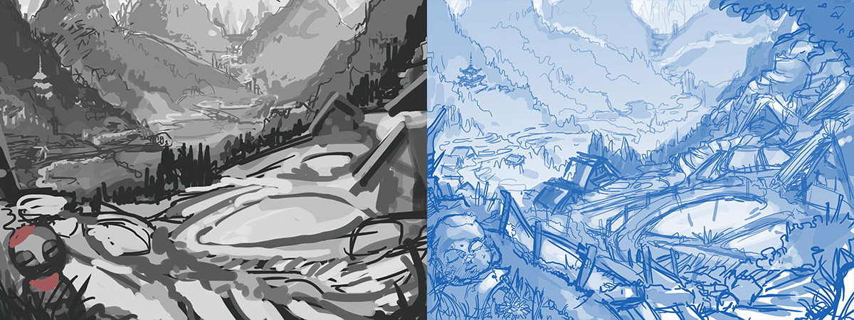 As of now, the game is still very much a skeleton model of concepts which are being fleshed out onto a frame, which will later on support the game itself. The areas in the game involve a slightly more complicated way of fabricating them. First, I personally go through a lot of different concepts from real world examples and get in touch with what I’d consider to be a concept that would be plausible (believable) in real life, should the mythological and fantasy aspects be stripped off. Then the process moves onto negotiating with the background artist in order to create a sketch of the area, which can then be used as a reference to find historical inaccuracies that can either be covered with a fantasy equivalent, or require further investigation from their real life counterparts. A good example would be the traditional Japanese style ‘Minka’ thatched roof houses. We had an exchange of quite the few messages in order to determine how the windows were sealed during the winter time, as glass panes were obviously not in use at the time in the real world. This of course leads to the question as to whether it is necessary to go into such detail for the sake of a fantasy game, but as said in the previous post, I personally think it is worth it in the end. Even if to just deepen the feel for the game world itself; The game being after all, a re-imagining of a popular concept through Westerners’ eyes. After this process is done, it is used by the other artists to create a unified feel to the derivative artworks, such as the tilesets, which are being used in the game world itself.