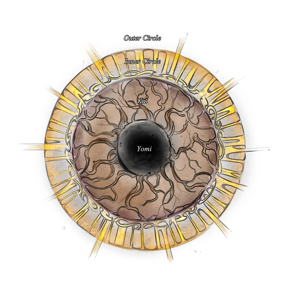 This is the land known by many names, such as Yomi (府 The Underworld), Yo no Kuni (夜の国 Land of Night), and Mu (無 Void). A shadowy land rumoured to exist at the center of the earth, and a place from where different malign creatures come from to haunt the mortal realm. It is believed that the souls of the dead that did not reach enlightenment to break out of the karmic circle fall here through the murky shadowy depths to meet with Yôh (王 Lord of the Underworld) in order to be judged. The soul is then decreed a time to serve in Yomi for a time period depending on their sins in the mortal world, and then  further returned to the karmic cycle to be reborn as a mortal again in search of true virtue and enlightenment.
